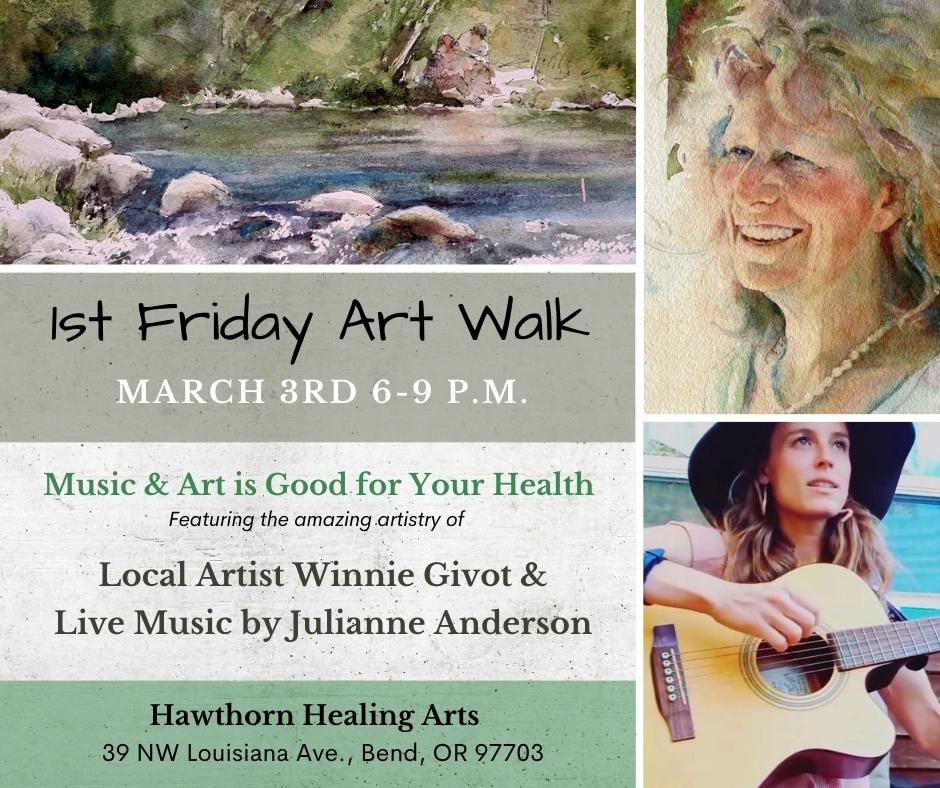 Hawthorn Healing Arts Center offers an Open House to be held in conjunction with First Friday Art Walk. The Art Walk is a downtown Bend community event and everyone is welcome to attend. Come meet the Hawthorn providers and check out the amazing art of local artist Winnie Givot, while enjoying the music performed in our lobby by Julianne Anderson.